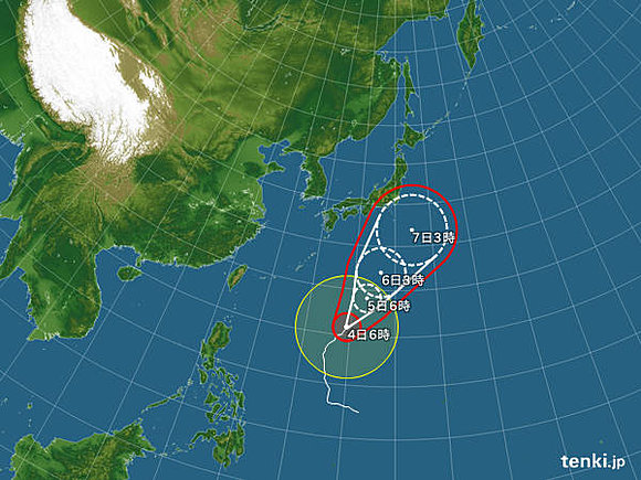 きょう4日は強い勢力を保ちながら日本の南海上を北上し、あす5日は勢力を次第に弱めながら、上空の風に乗って徐々に加速する見込み。