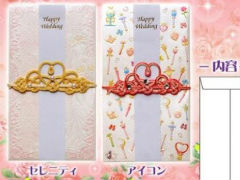 女性らしい上品な「セレニティ」柄、そしてキュートな「アイコン」柄のご祝儀袋はパール紙にエンボス加工された豪華な仕上がりで、ティアラモチーフの水引飾りがついています。本体1枚に中袋1枚、短冊(Happy Wedding、寿、無地)が3枚が付属しています。「大きくなったらタキシード仮面さまのお嫁さんになるのー!」と言っていた世代がご祝儀袋を使う年頃になるとは……感慨深いですね。同じ夢を見たお友達に喜ばれることでしょう。