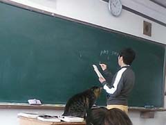 猫ちゃんが机の上でのんびりくつろいでいるのをよそに、先生と生徒のみなさんは構わず授業を進めています。もうみんな慣れっこなのか、猫ちゃんは追い出される様子もありません。