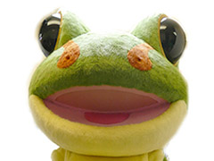 カエルのパペット型電子楽器「コケロミン・ライム3」。腹話術を使わなくても50音で歌えます