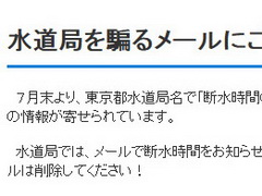 7月末から情報が寄せられており、メールのリンク先からは出会い系サイトなどに誘導されるとして、URLはクリックしないでメールは削除するように呼びかけている。水道局ではメールで断水時間を知らせることはない。
