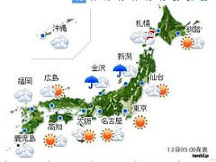 また、山陰も、山では雪となり、明日にかけて今季初の積雪となる所もある見込み。峠越えの車は、冬の装備を。そのほかは、日中は晴れ間の出る所が多い。東海から西は一日冷たい北よりの風が吹いて、気温はほとんど上がらず。最高気温は、名古屋で13度、大阪で14度など、広い範囲で今季一番の寒さとなりそう。