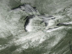 上空にはこの時期としては強い寒気が流れ込み、北米の五大湖周辺(上の画像参照)には冬季の日本海でもよく見られる筋状の雲(雪雲)が確認できます。