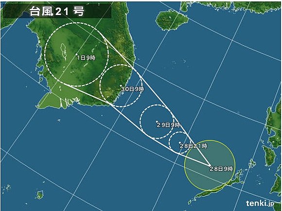28日午前9時に、南シナ海で台風21号が発生。名前はミクロネシアが用意した「シンラコウ」で、「伝説上の女神」。今後、西寄りに進みベトナムへと近づく見込み。