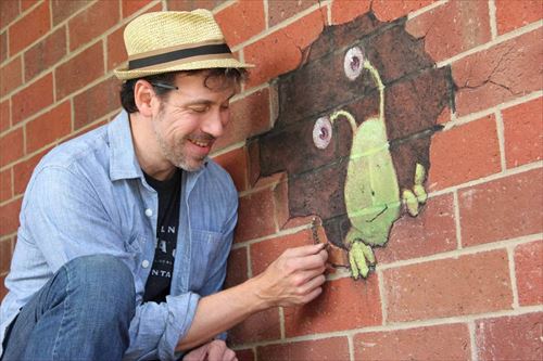 ジンさんのオリジナルキャラクターSluggo(スラッゴー)も活躍しています。Sug(ナメクジ)のような緑色のキャラです。まるでエイリアンみたいですが、ジンさんによると、「Sluggoはエイリアンと言われることが多いけど、UFOじゃなくて、歩道や壁に住んでいる、心優しいモンスターなんだ。足元に何か楽しいことがあるって、みんなに気づかせてくれるのがSluggoなんだよ」ということです。