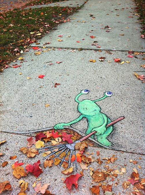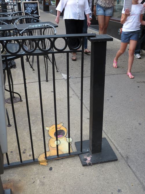 あわただしく通り過ぎていくだけの都会の風景。そんな何でもない日常に、ふっとまぎれこんできた、かわいらしいキャラクターたち。アメリカ、ミシガン州アナーバーのアーティスト、デイビッド・ジンさんは路上にチョークでいろいろなアートを描いて、人々を和ませています。