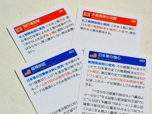 太平洋戦争で起きたエピソードはカードのイベントとして再現する。“日本軍の慢心”では、連合軍の空襲力と戦闘力は2段階アップ、日本軍は2段階ダウンと凶悪な効果を発揮する。ただし、状況によって、カードを“資源”として使いたいときが多いので、その決断に苦慮することになるだろう。これぞ、太平洋戦争の海軍作戦における“最も大きな悩み”を再現していると言える