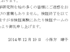 「どのような状況下であっても必ず十分な結果をと思い必死に過ごした3か月でした。予想をはるかに超えた制約の中での作業となり、細かな条件を検討できなかった事などが悔やまれますが、与えられた環境の中では魂の限界まで取り組み、今はただ疲れ切り、このような結果に留まってしまったことに大変困惑しております。私の未熟さゆえに論文発表・撤回に際し、理化学研究所を始め多くの皆様にご迷惑をおかけしてしまったことの責任を痛感しておりお詫びの言葉もありません。検証終了を以て退職願を提出させていただきました。最後になりますが本検証実験にあたり検証チームの皆様はじめ、ご支援・応援してくださった方々に心より御礼申し上げます」
