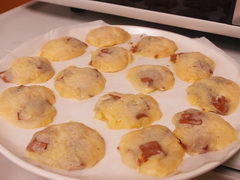 作り方は上とほとんど同じ。材料をすべて混ぜ、今回は生地がやわらかめなのでスプーンで落としていきます。先ほど同様、500Wのレンジで2分10秒ほど温めると……。