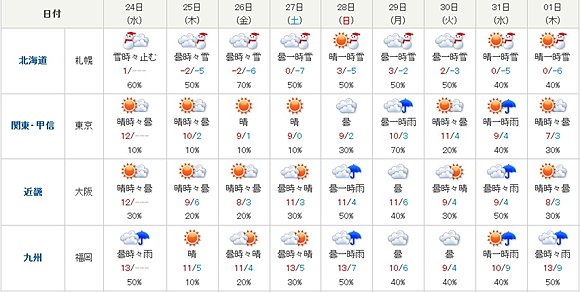 今年もあと一週間。tenki.jpの10日間予報で、2015年元日の予報も追加されました。晴れる所もかなり寒くなりそうです。