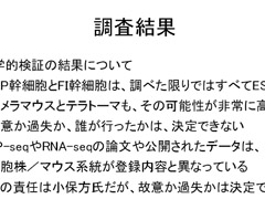 理化学研究所および調査委員会は12月26日、STAP細胞論文に関する調査結果について記者会見を行い、論文内でSTAP細胞とされていたものについて、既存の「ES細胞」が混入していた可能性が高いと発表した。