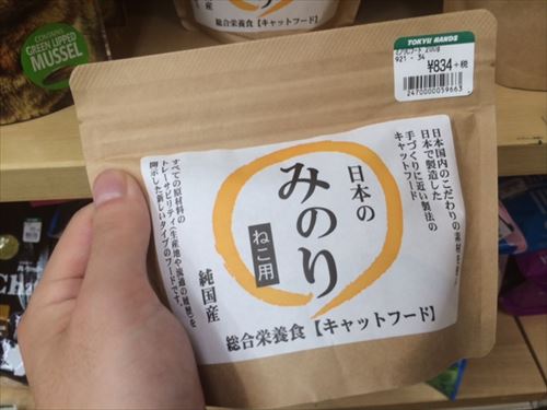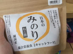 「日本のみのり」というキャットフードです。見るからに高級感ありますね! 素材からこだわっているそうです。お値段は、834円+税で、900円! 高級ですね〜〜〜!!!