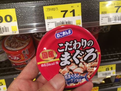 「こだわりのまぐろ」というキャットフード。値段が71円+税で、76円です。安いですね〜〜〜!!