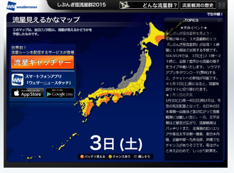 ウェザーニューズではしぶんぎ座流星群の特設ページを設けており、また3日午後10時からは24時間ライブ放送番組「SOLiVE24」で全国7カ所から流星の同時中継を行う予定。
