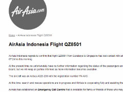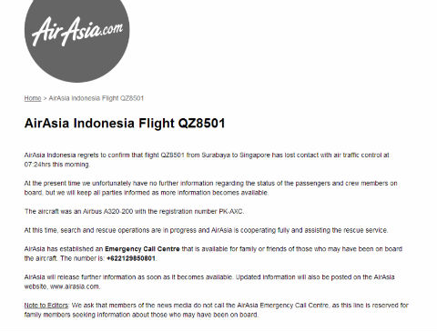 エアアジアは、インドネシアを出発したQZ8501便が消息を絶ったことを明らかにした