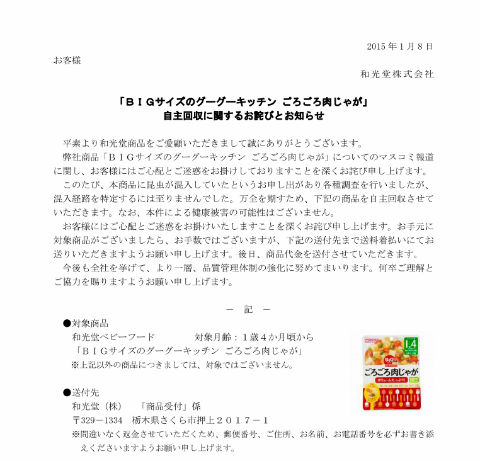 混入の指摘があった「BIGサイズのグーグーキッチン ごろごろ肉じゃが」を回収する。