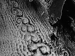 流れの中に置かれた物体の風下方向にはカルマン渦と言われる不思議な渦巻きができることがあります。このような渦巻きは雲でも見られることがあります。