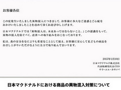 1月10日、マクドナルドは相次ぐ異物混入について改めて「この度発生いたしました異物混入につきまして、お客様に多大なご迷惑とご心配をおかけいたしましたことを改めて深くお詫び申し上げます」と日本マクドナルド代表取締役社長CEO サラ・エル・カサノバ氏の名で謝罪コメントを公開した。
