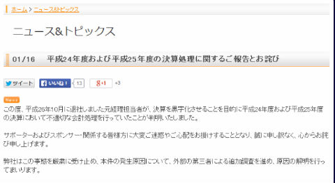 2012年度と2013年度の決算において、昨年退社した元経理担当者が不適切な会計処理を行って黒字化させていたと説明しています。「誠に申し訳なく、心からお詫び申し上げます」と謝罪し、外部の第三者による追加調査で原因の解明を行うとしています。