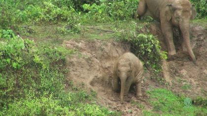 ゾウには肌を乾燥から守るために泥遊びをする習性があり、滑った跡は川への道にもなって、まさに一石二鳥といったところ。