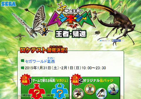 1月31日・2月1日には新ムシキングのロケテストをセガワールド葛西(東京都江戸川区)で行う。2月14日には、幕張メッセ(千葉県千葉市)で開催のジャパンアミューズメントエキスポ(JAEPO)に出展する予定。