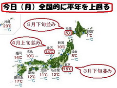 南風が入り気温上昇。東京の予想最高気温は15度で桜のつぼみがほころぶ頃の気温。金沢は4月上旬並みの14度まで上昇。全国の暖かさは明日まで。明後日は一気に厳寒へ。
