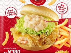 「かっぱえびせんバーガー」(単品380円・税込)は砕いたかっぱえびせんをエビカツの衣にしたもの。さらにかっぱえびせん風味のシーズニングをかける「かっぱえびせんふるポテ」(単品300円・税込)も発売します。