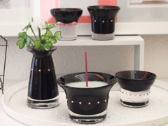 黒色ベースのガラス仏具にピンクと透明のラインストーンをあしらったキラキラ感のある仏具。「オトナかわいい」をテーマに女性デザイナーが企画したもので、制作はすべてハンドメイド。光が当たる角度によって印象が変わる「魅せる仏具」として、おしゃれな雑貨やインテリアのように部屋全体に調和するように作られています。「香炉・火立・花立」の3点セットが4万2800円(税込)、「仏飯器・茶湯器」を加えた5点セットは6万6800円(税込)。