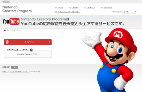 同プログラムへの参加に必要なのは、YouTubeで使うGoogleアカウントと、収益を受け取るためのPayPalのアカウント。広告収益のシェア比率は、原則としてチャンネルが70%、動画が60%。プログラムの対象となるゲームのリストは特設サイトで確認できる。「スーパーマリオブラザーズ」「ゼルダの伝説」など、ファミコン、ゲームボーイ、Wiiといった各種ハード向けに日米で発売されたタイトルが並んでいる。