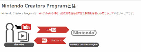 これまで、任天堂の著作物が含まれるYouTube動画から発生する広告収益は任天堂に付与されていたが、「Nintendo Creators Program」ではユーザーがYouTubeチャンネルや動画を登録することで、自身の動画から得られる広告収益を任天堂と分け合う。