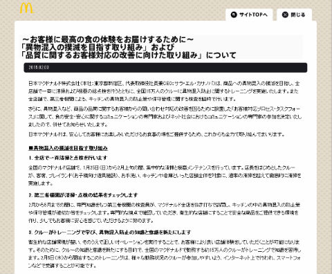 日本マクドナルドは先ごろの異物混入騒動を受けて、「異物混入の撲滅を目指す取り組み」を発表した。