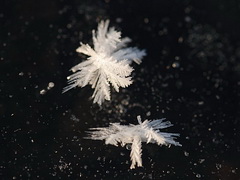 白い花の正体はズバリ、水蒸気の結晶です。どのようにして生まれるかというと、まず、湖面から蒸発した水蒸気が凍って、氷のカケラなどの小さく突起した部分にくっつきます。その突起を中心に水蒸気が次々に凍りつき、結晶となって大きく成長し、美しい花のような形になるというわけです。