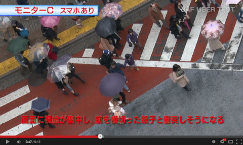 スマホを使用している人としていない人でどのような違いがあるのかを比較した内容となっており、人間がどこを見ているのかを表示する「アイマークレコーダー」の映像も交えて、「ながらスマホ」による注意力の低下や回避行動の遅れなどがはっきりと分かる映像となっています。