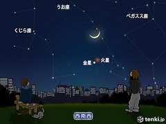 今日21日の夕方、西の低い空に、細い月が浮かびます。さらに、そのすぐ下には、ひときわ明るく輝く金星と、赤っぽい火星の姿も見られます。