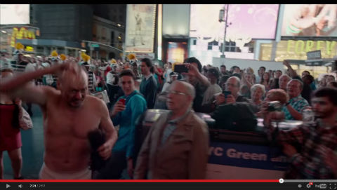 衣装替えの際に更衣室から閉め出されて下着姿で登場――という設定で、ノミネート作品「Birdman」(邦題「バードマン あるいは(無知がもたらす予期せぬ奇跡)」)のオマージュのようです。同作には劇場から閉め出された登場人物が白ブリーフ姿で街中を走るシーンがあり、それを踏まえた演出というわけですね。「Birdman」は監督賞・作品賞・脚本賞・撮影賞を受賞しています。