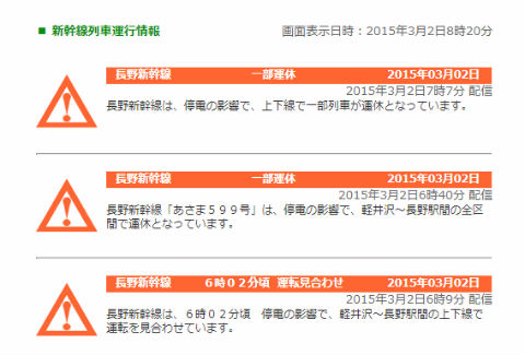 3月2日朝、長野県で停電が発生し、鉄道などにも影響が出ている。変電所トラブルの影響と報じられている。