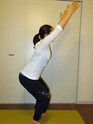 2. 椅子に座るように、お尻を下に落としながら、両手と目線を斜めに上げます。空気椅子のイメージで、太ももの筋肉を使います。このとき、つま先よりも前に膝が出ると関節に負担がかかるので注意してください。