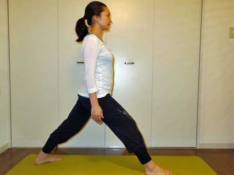 1. ヨガマットの後ろの方に立ち、大きく1歩踏み出します。