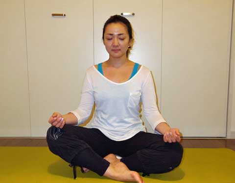 1. あぐらや正座、仰向けに寝転がるなど、自分がリラックスできるポーズをとります。今回、先生はあぐらをかいています。