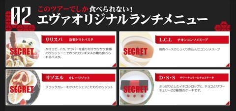 ツアー参加者には「エヴァオリジナルランチメニュー」として、リリスをモチーフにした「リリスパ(冷製パスタ)」から「リゾエル(カレーリゾット)」、「L.C.L(チキンコンソメスープ)」、「D.S.S(サワーチェリーとチョコケーキ)」と、エヴァファンならニヤリとしてしまいそうなオリジナルメニューが用意されています。1日中エヴァのことだけを考えて過ごせそうですね。