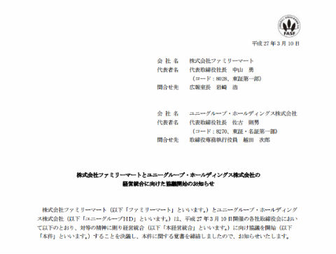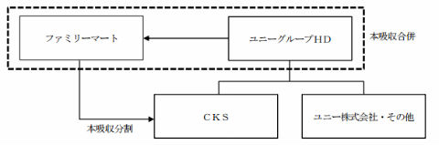 9月をめどに経営統合を行うべく検討していく。ファミリーマートを吸収合併存続会社、ユニーグループHDを吸収合併消滅会社とする吸収合併を行い、その後統合会社のコンビニ事業をユニーグループHDの子会社サークルKサンクスに引き継ぐ。