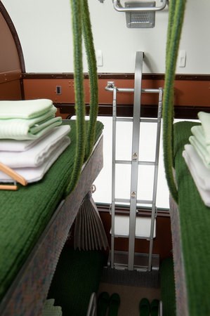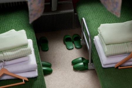 B寝台は2段ベッドを向かい合わせに設置した開放式の寝台。製品化に当たって、実車を取材してベッド、はしご、テーブルからカーテン、スリッパ、ハンガーや浴衣に至るまで、布地の材質にもこだわって再現したという。