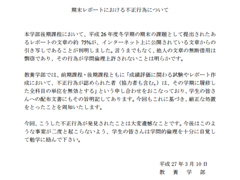 東京大学の教養学部が、「期末レポートにおける不正行為について」という告知をネットに掲載しています。