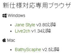 3月13日現在、WindowsではVersion 3.80以降の「Jane Style」、MacではVer2.5以降の「BathyScaphe」などが利用できます。その他、iOS、Androidに対応しているものも。詳細は「2ちゃんねる専用ブラウザをご利用の皆さまへ」という文章からご確認ください。