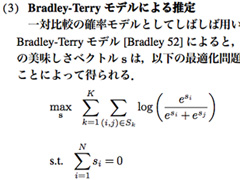 論文では、試食者9人による八ッ橋主要11銘柄の評価を基に、勝率、主固有ベクトル、Bradley-Terryモデル、Crowd-BTモデルを統合したランキングを作成し、その結果を比較しています。まず、ランキング決定問題の定義としては、N種類の八ッ橋{y1,…,yN}およびK人の評価者{a1,…,aK}を考え、評価者akによって八ッ橋yiが八ッ橋yjよりおいしいと評価された場合……………………って文系脳じゃよく分かんないよ!!!!! 何だよ「美味しさベクトルs」って!!!!!!! なんかカッケーよ!!!!!!!!