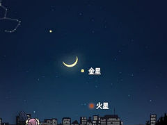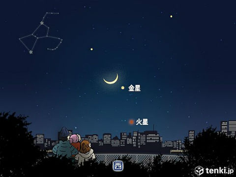 きょう23日、日の入り後、西の空には細い月。さらに、明るく輝く金星と、赤っぽい火星が並びます。