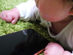 しかしさすが思い通りにはいかないレリゴーな生後4カ月。ただただディスプレイにはよだれが滴り落ちていく。だが、安心! 「ARROWS NX」は防水防塵なので大量のよだれにも対応している。よだれの海に沈んでも平気なのだ。