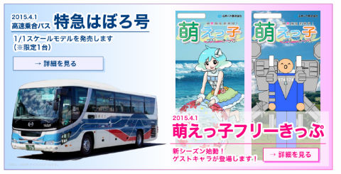 北海道の沿岸バスがバスの1/1スケールモデルを発売。精巧さで大手玩具メーカーに負けないというモデルのお値段は1台5000万円! エゾシカよけの鹿笛も付いてきます。さらに萌えキャラを起用した「萌えっ子フリーきっぷ」にゲストキャラとして江ノ島の「江ノ島さんぽ」と、自衛隊宮城地方本部Twitterの中の人がパワポで描いたイージス艦(関連記事)が加わります。