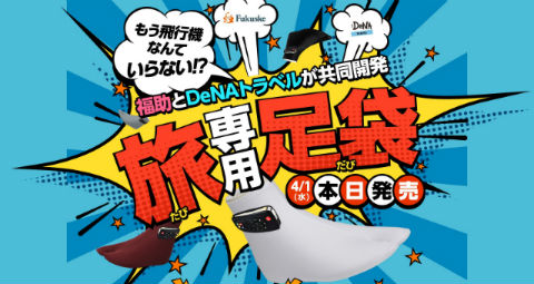 旅行サービス「DeNAトラベル」が、福助と「旅(たび)専用足袋(たび)」を開発。3トンまで荷物が運べ、空が飛べ、時速100キロで走れ、全身の洋服チェンジもできる優れもの。価格は5色セットで100万円となっています。
