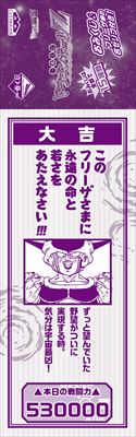 購入すると付せんとおみくじが入っており、おみくじに記載されたIDナンバーを専用サイトに入力してモバイルくじに挑戦できます。モバイルくじの景品はA賞がフリーザ様のちびきゅんキャラフィギュア、B賞はフリーザ様のオリジナルボイスダウンロードとなっています。